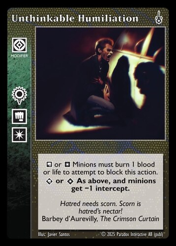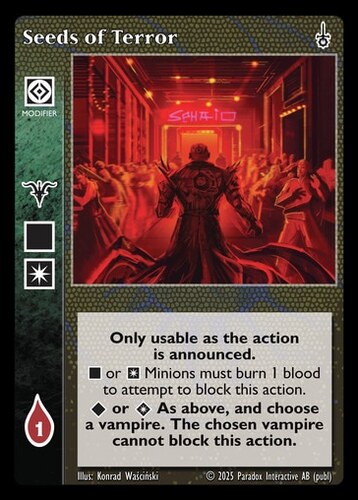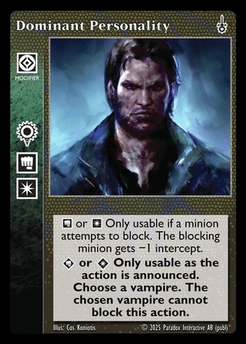 Presence est la disciplne majoritairement utilisée dans les decks de vote. En plus de permettre de belles options lors des actions politiques, elle offre quelques options de bleed qui peuvent s’avérer dévastatrices. Enfin, Presence contient aussi quelques possibilités en ce qui a trait au combat.